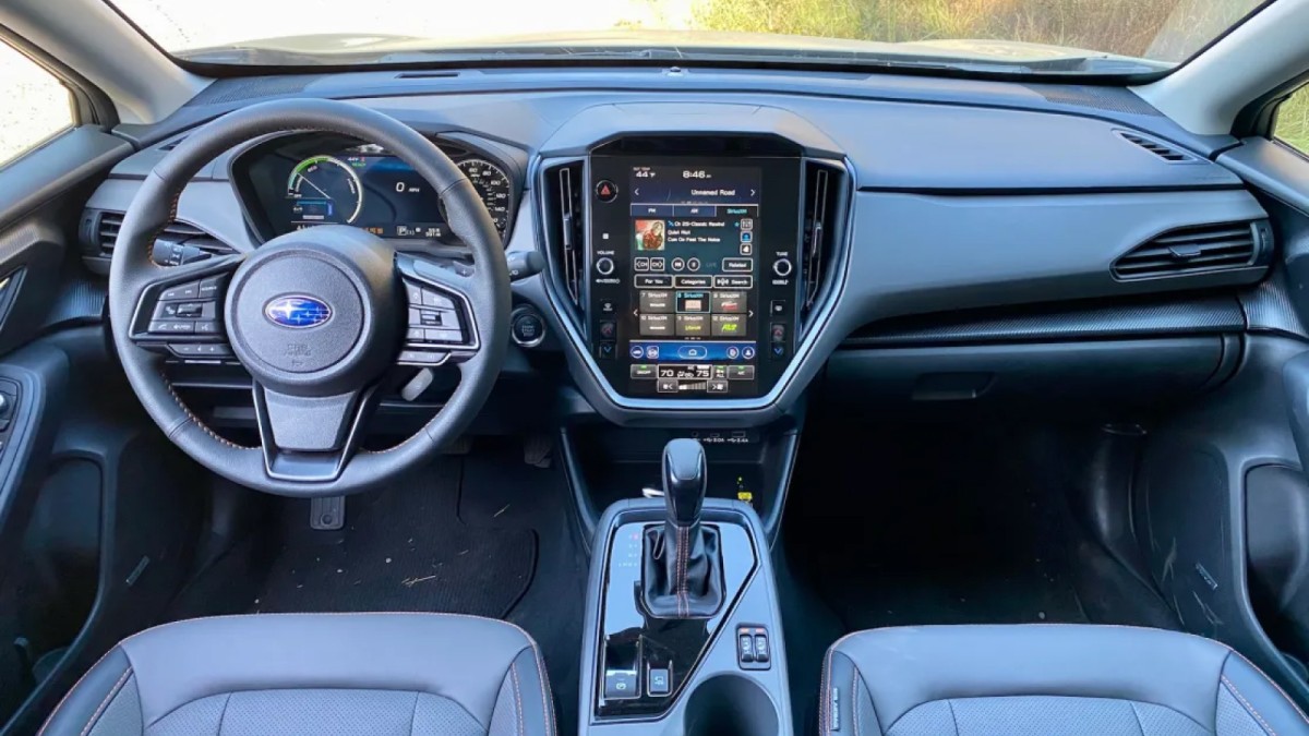 درون کابین Crosstrek Hybrid ترکیبی از سادگی، فناوری و راحتی دیده میشود. صفحهنمایش دیجیتال بزرگ ۱۲.۳ اینچی با گرافیک مدرن و سه حالت نمایش اطلاعات، تجربهای تازه از محیط رانندگی ارائه میدهد. نمایشگر لمسی ۱۱.۶ اینچی مرکزی امکاناتی چون کنترل سیستم چندرسانهای، وضعیت انرژی هیبریدی و حالتهای رانندگی را به نمایش میگذارد.