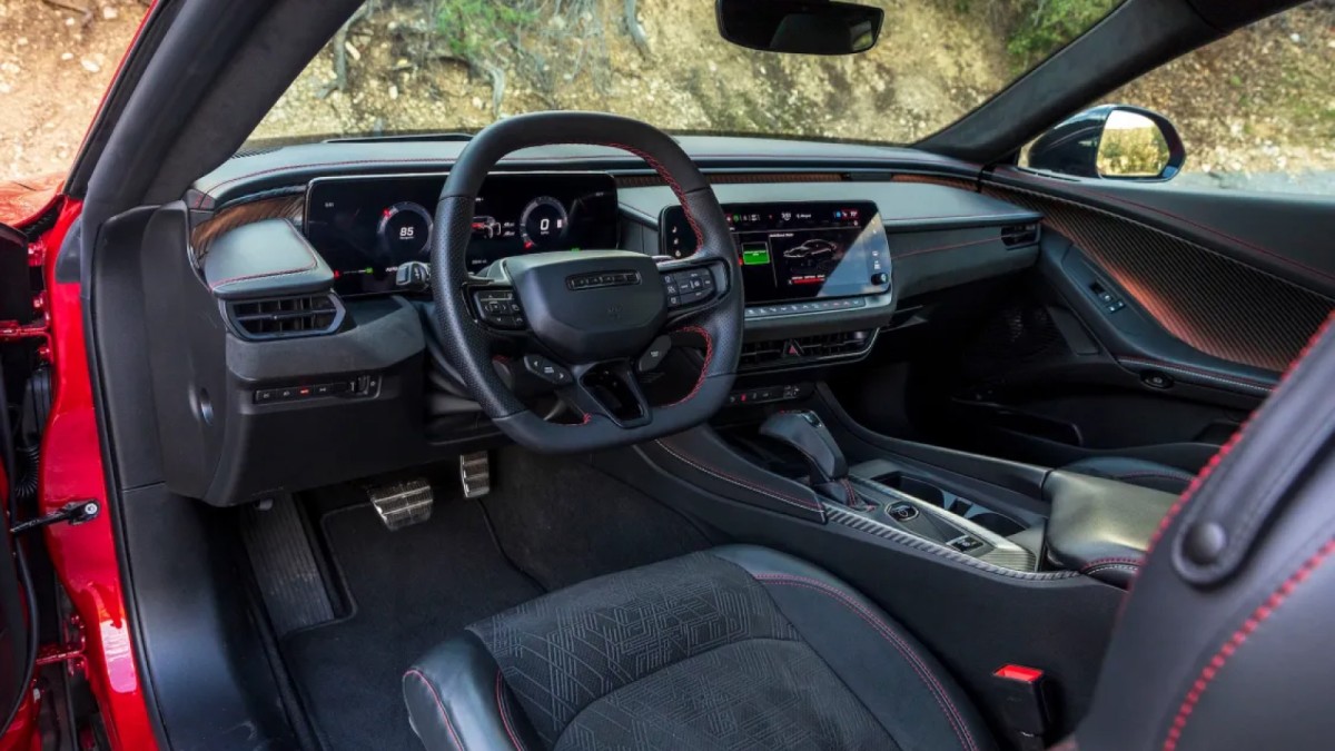 فضای داخلی چارجر جدید یکی از بزرگترین پیشرفتهای آن محسوب میشود. کابین با ترکیبی از طراحی اسپرت و فناوری روز ساخته شده و از متریال باکیفیت بهره میبرد. نمایشگر مرکزی ۱۲.۳ اینچی با سیستم Uconnect 5، پشتیبانی از Apple CarPlay و Android Auto بیسیم، و نورپردازی داخلی هوشمند، تجربهای مدرن را برای راننده فراهم میکند.