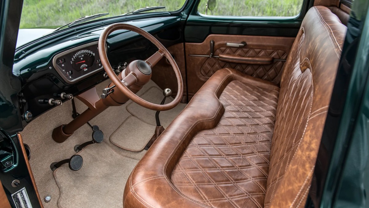 فضای داخلی F100 بازسازیشده، ترکیبی از لوکس بودن و حفظ سبک کلاسیک است. داشبورد طراحی هنری دهه 1950 را به نمایش میگذارد و چرم Saddle با رنگ سبز تیره بدنه هماهنگ شده است. امکانات مدرن شامل سیستم صوتی Kicker Audio، کولر باریک و دستهدنده طلایی پنج سرعته، تجربهای بینظیر برای راننده فراهم کردهاند. طراحی مینیمال و ارگونومیک باعث شده تا راحتی و زیبایی در کنار هم حفظ شوند.