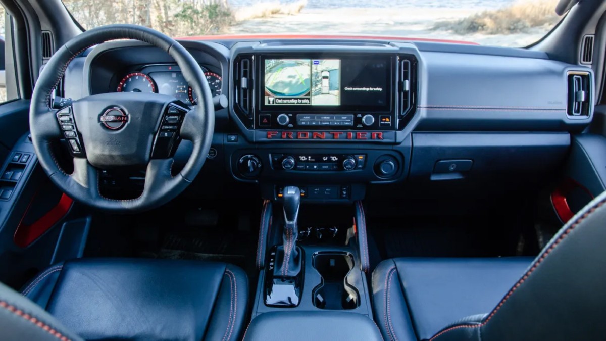 در داخل کابین، نیسان ترکیبی از ویژگیهای مدرن و سنتی را ارائه میدهد. استفاده از دوختهای قرمز و نشان بزرگ "FRONTIER" روی داشبورد، حس اسپرت و ماجراجویانهای را منتقل میکند. البته یکی از بزرگترین تغییرات، نمایشگر 12.3 اینچی جدید است که نسبت به مدل قبلی یک ارتقای قابل توجه محسوب میشود. بااینحال، در مقایسه با صفحه نمایش رقبایی مانند تویوتا تاکوما، همچنان کمی قدیمی به نظر میرسد.