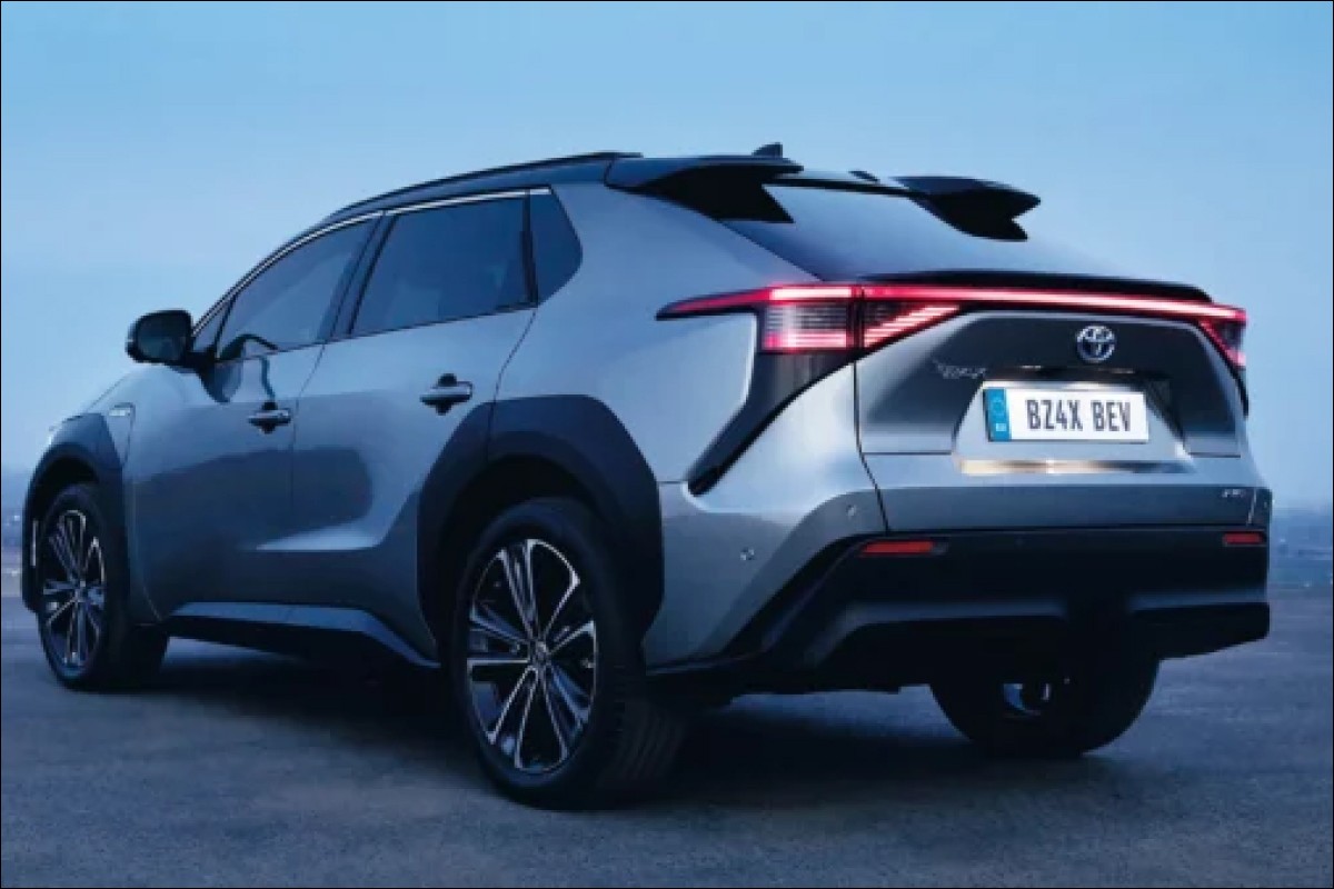 در نمای جانبی، چرخهای بزرگ، فلاپهای پلاستیکی مشکیرنگ روی گلگیرها و سقف شیبدار، جلوهای اسپرت و مدرن به خودرو میدهد. طراحی عقب نیز با چراغهای متصل به هم و اسپویلر دوقلو بر جذابیت BZ4X افزوده است.