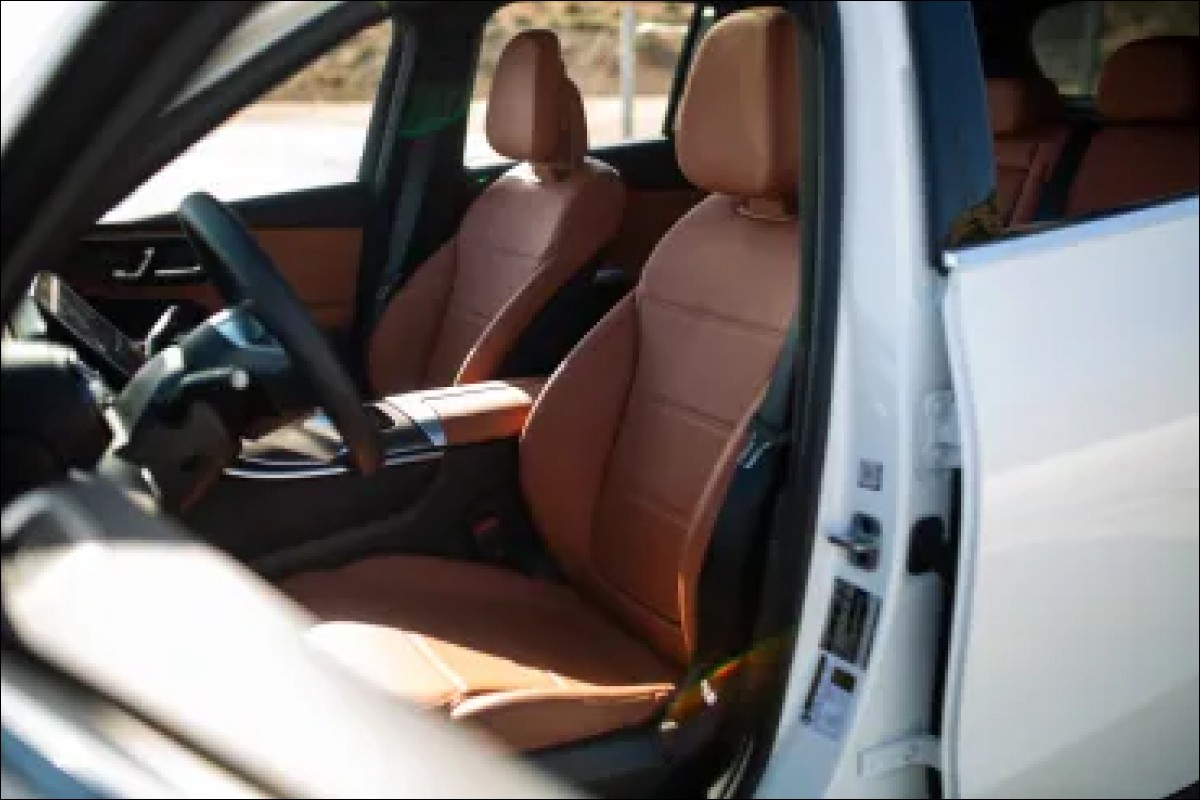 مرسدس در GLC300 از طراحی کاملاً جدید کابین استفاده کرده است. نمایشگر عمودی 11.9 اینچی MBUX در مرکز داشبورد قرار گرفته و تقریباً تمام دکمههای فیزیکی حذف شدهاند. صندلیهای چرم مصنوعی MB-Tex بسیار راحت و نرم بوده و طراحی کابین با نورپردازی محیطی چندرنگ، تجربهای لوکس و آرامشبخش را در اختیار سرنشینان قرار میدهد.