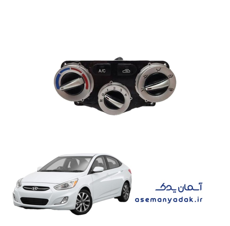 کلید کنترل تهویه به کاربر اجازه میدهد تا بهطور دقیق تنظیمات مربوط به دما، سرعت فن، و جهت جریان هوا را مدیریت کند. این کلید همچنین شامل دکمههایی برای روشن یا خاموش کردن کمپرسور کولر، تنظیم حالت گردش هوای داخلی یا خارجی، و انتخاب حالتهای دمنده به شیشه، پاها یا کابین است. در برخی مدلهای هیوندای اکسنت، این کلید با نمایشگر دیجیتال یا نشانگرهای LED همراه است که امکان مشاهده و تنظیم بهتر را فراهم میکند.